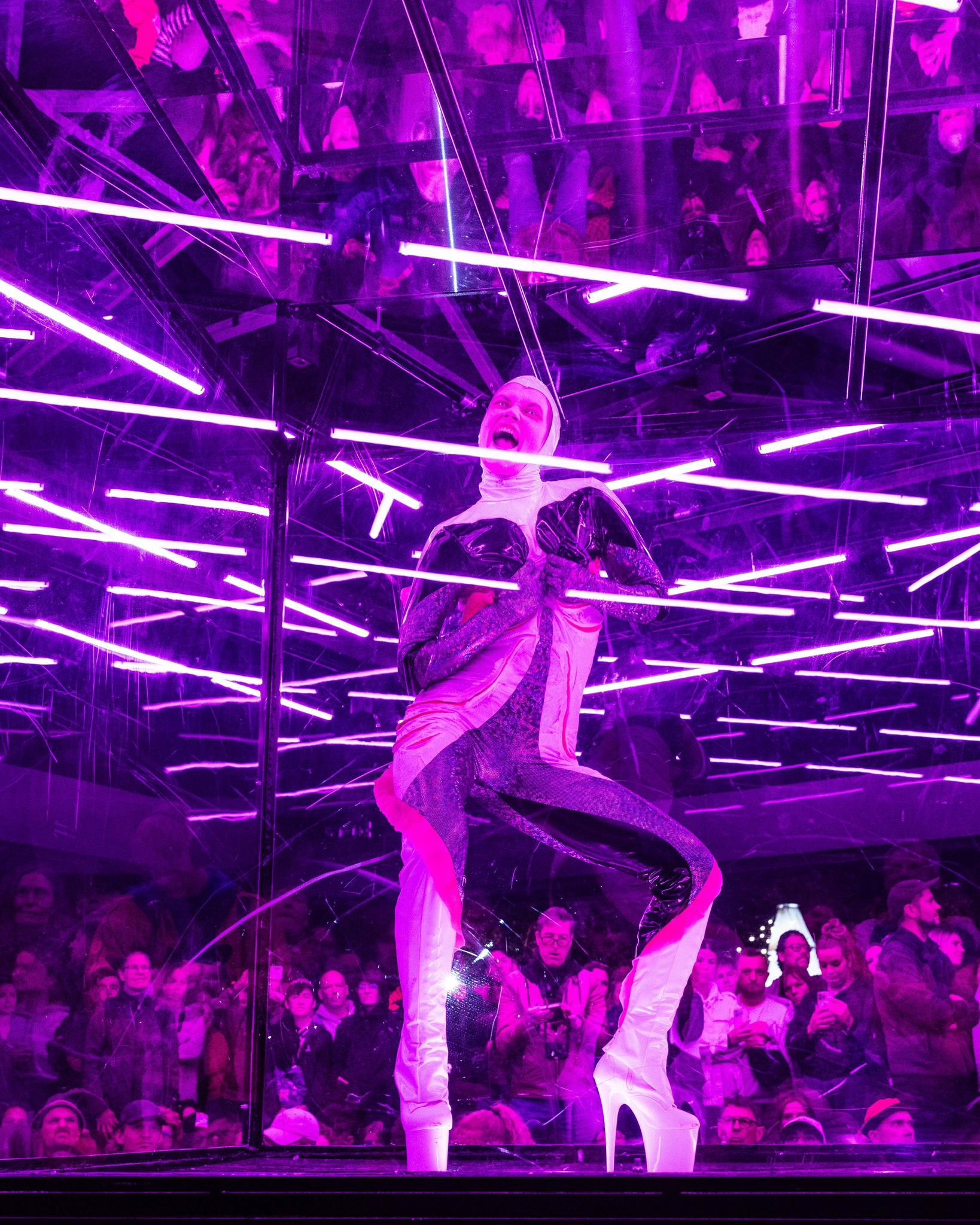 ‘RIPE BODY’ unfolds within a three-meter-high transparent box with mirrored ceiling and floor, transforming the body into a living sculpture that explores and challenges various physical forms and power structures. In the panopticon of the mirrored room, the gaze of the dancer and the audience is constantly thrown back and forth, raising the question of who is truly observing whom.